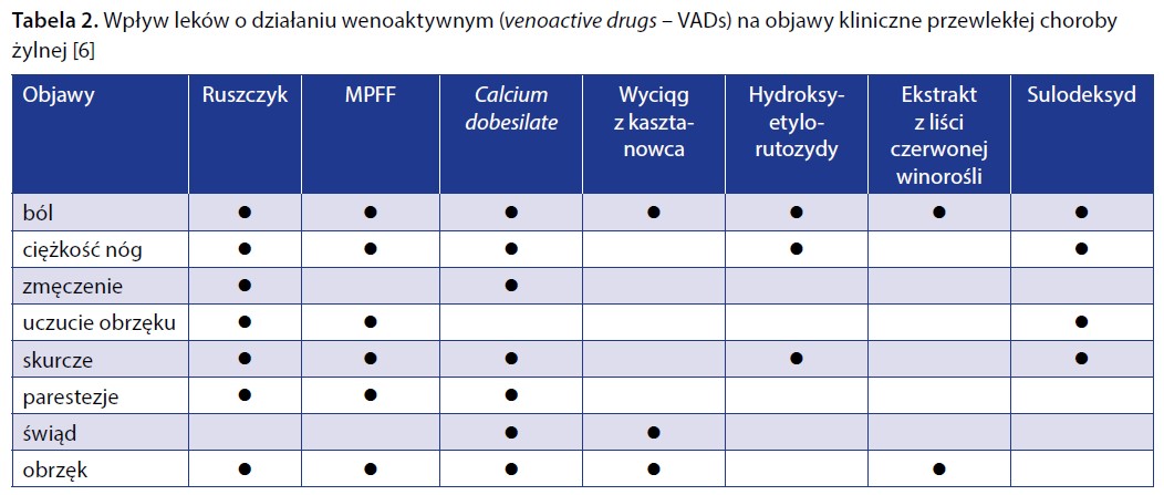 Obecnie mamy dowody, że w porównaniu z placebo VADs mogą korzystnie wpływać na zmniejszenie obrzęków i na niektóre objawy podmiotowe i przedmiotowe PChŻ, takie jak ból, skurcze, niespokojność nóg, uczucie obrzęku, parestezje, obrzęk i zaburzenia troficzne. Wpływy VADs na objawy kliniczne PChŻ zestawiono w tabeli 2.