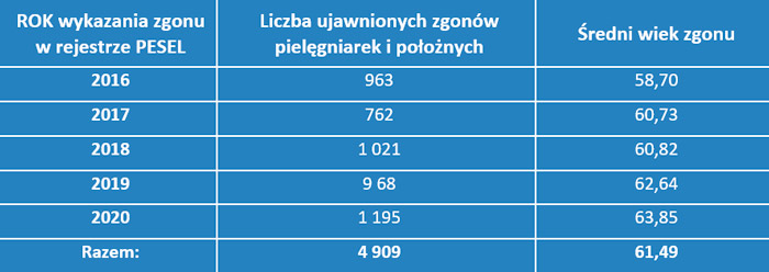 W raporcie czytamy, że „statystyczna pielęgniarka, położna żyje krócej niż statystyczna Polka”. Naczelna Izba Pielęgniarek i Położnych wylicza, że średnia ich wieku w chwili zgonu to tylko 61,5 roku. Są to dane znacznie niższe niż dla całej populacji.