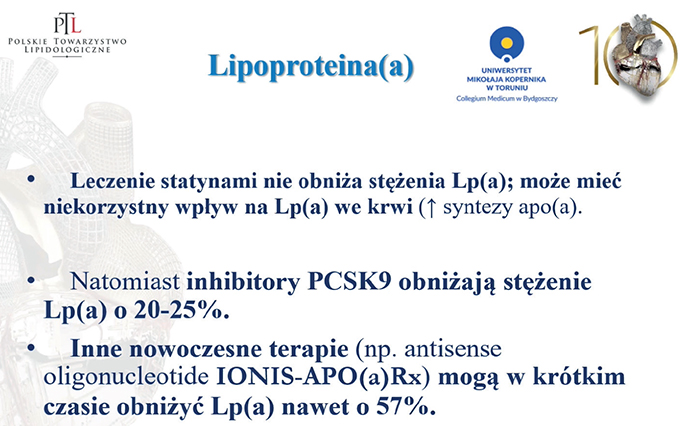 Stężenie lipoproteiny(a) jest uwarunkowane genetycznie, nie cechuje się zmiennością wewnątrzosobniczą, a zatem wystarczy oznaczyć je raz u każdego dorosłego. W szczególności u osób, u których wystąpił incydent sercowo-naczyniowy, pomimo że stężenie cholesterolu LDL mieści się u nich w zakresie celu terapeutycznego. To badanie jest również pomocne i wskazane w stratyfikacji ryzyka sercowo-naczyniowego u młodych osób ze zmianami miażdżycowymi, a także u pacjentów z rodzinną hipercholesterolemią – podwyższone stężenie lipoproteiny(a) może mieć nawet 30–40 proc. z nich. Profesor Grażyna Odrowąż-Sypniewska przypomina, że leczenie statynami nie obniża stężenia lipoproteiny(a). Przeciwnie – może mieć negatywny wpływ, gdyż wykazano, że statyny mogą nasilać syntezę białka apo(a) w wątrobie. Inhibitory PCSK9 natomiast w znacznym stopniu obniżają stężenie lipoproteiny(a) w krótkim czasie.