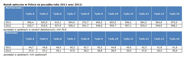 Jak wynika z danych pochodzących z panelu aptek współpracujących z IMS Health, niezależną firmą badającą rynek farmaceutyczny, sprzedaż leków i innych produktów farmaceutycznych w aptekach (mierzona w PLN na poziomie cen detalicznych brutto) spadła po 14 tygodniach 2012 roku o blisko 11 proc. w ujęciu rdr i wyniosła ponad 7,3 mld złotych