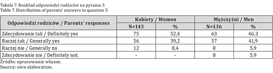 Odpowiedzi respondentów na pytanie (pyt. 3) w brzmieniu, czy uważa pani, pan, że państwa dziecko ma świadomość zagrożeń, jakie wywołuje pandemia COVID-19, przedstawiono w tabeli 5.