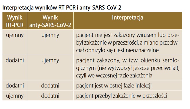 – Najlepiej byłoby wykonywać oba badania równolegle, czyli zrobić wymaz z gardła i oznaczyć przeciwciała z surowicy. Wtedy można by sprawdzić, czy pacjent w ogóle jest zakażony, a jeśli tak, to w jakiej fazie infekcji – podpowiada dr Beck. Dostępny jest jeszcze test antygenowy, wykrywający białka wirusa, jeśli w pobranym od pacjenta materiale jest ich dostatecznie dużo. Biorąc jednak pod uwagę obecny stan wiedzy, istnieje wiele wątpliwości co do wartości diagnostycznej dostępnych testów. Wskazane jest zdefiniowanie minimalnych wymagań jakościowych, jakie taki test powinien spełnić, przed wprowadzeniem go do szerszego wykorzystania. Należy ostrożnie podchodzić do testów wykrywających antygeny SARS-CoV-2, gdyż ich wartość diagnostyczna nie została dostatecznie potwierdzona w opublikowanych wynikach badań.