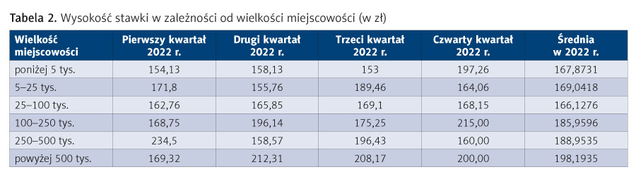 Najwyższe propozycje wynagrodzenia w 2022 r. statystycznie można było otrzymać w województwie małopolskim (209,43 zł), najniższe natomiast w świętokrzyskim (136,67 zł) oraz podlaskim (137,50 zł) – co w zestawieniu z liczbami ofert potwierdza regułę, że wraz ze wzrostem zapotrzebowania zwiększa się wynagrodzenie. Z analizy zebranych danych w kontekście wielkości miejscowości średnia oferowana stawka potrafiła jednorazowo zaskoczyć. Przez cały rok utrzymywał się trend wzrostu wynagrodzenia wraz ze zwiększaniem wielkości miejscowości (tab. 2).