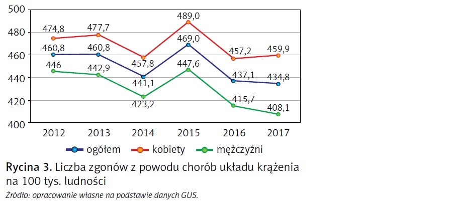 Istotny jest również fakt, że pomimo powszechnego przekonania, że to mężczyźni częściej „umierają na serce”, wskaźnik zgonów z powodu chorób układu krążenia w przeliczeniu na 100 tys. ludności jest znacznie wyższy wśród kobiet niż wśród mężczyzn: w 2017 r. 459,9 vs. 408,1, przy wartości 434,8 dla całej populacji (ryc. 3).