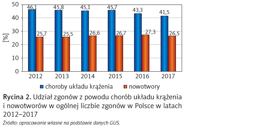 Choroby układu krążenia od wielu lat są pierwszą przyczyną zgonów w Polsce, o czym wiele osób (także podejmujących ważne decyzje polityczne) nie wie lub zapomina. Według danych GUS w 2017 r. były one odpowiedzialne za śmierć ponad 167 tys. osób w naszym kraju, czyli za 41,5 proc. wszystkich zgonów. Dla porównania – nowotwory ogółem (czyli druga w kolejności przyczyna) odpowiadają za 107 tys. zgonów, czyli 26,5 proc. Co istotne, w latach 2012–2017 mimo malejącego udziału zgonów z powodu chorób układu krążenia w ogólnej liczbie zgonów (z ponad 46 proc. do wspomnianych 41,5 proc.) bezwzględna liczba osób, które zmarły wskutek tej grupy schorzeń, zmieniła się nieznacznie, bo zaledwie o 6 proc. Niechlubny rekord pod tym względem odnotowano w 2015 r. (ryc. 1 i 2).