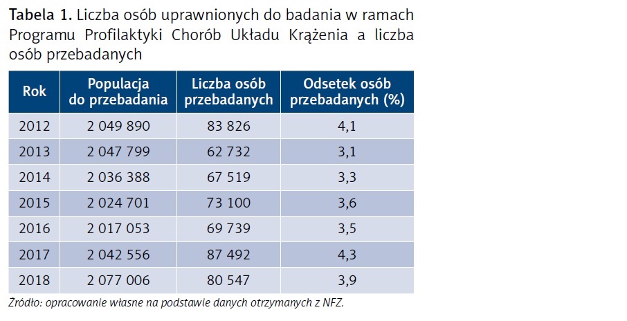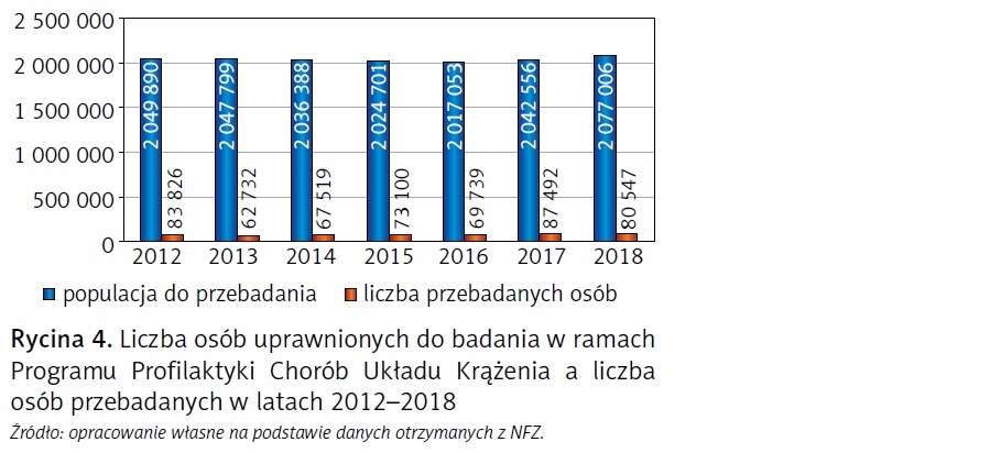Jak wygląda w perspektywie ostatnich kilku lat realizacja programu profilaktyki chorób układu krążenia? W celu odpowiedzi na to pytanie autor wystąpił do NFZ o dane dotyczące liczby osób upoważnionych do skorzystania z programu oraz liczby osób, które z niego skorzystały (tzn. zostały sprawozdane przez świadczeniodawców i wypłacono za nie określone w przepisach wynagrodzenie).