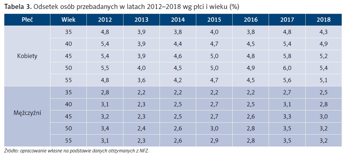 Wśród przedstawicieli obu płci średnio najwięcej osób korzysta z programu w wieku 50 lat (4 proc. uprawnionych) oraz 45 lat (3,9 proc. uprawnionych). Przy uwzględnieniu podziału na płeć wygląda to podobnie: najwięcej kobiet korzysta z programu w wieku 45 i 50 lat (po 5 proc.), a najwięcej mężczyzn w wieku 50 lat (3 proc.) oraz 55 lat (2,9 proc.). Najmniejszy odsetek pacjentów korzystających z programu obserwowano co roku wśród osób w wieku 35 lat – w całej populacji średnio 3,3 proc., wśród kobiet 4,2 proc., a wśród mężczyzn – 2,4 proc. (tab. 3).