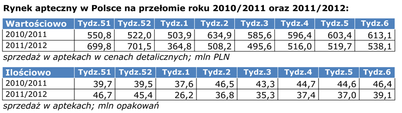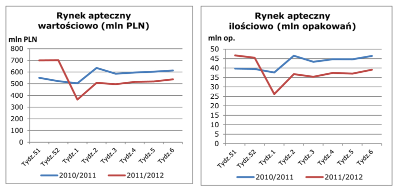 Na taki obraz rynku aptecznego na początku lutego nadal wpływa wprowadzenie nowej listy leków refundowanych od stycznia 2012 roku. Zapasy leków, jakie pacjenci zgromadzili w grudniu ubiegłego roku w obawie przed wzrostem ich cen lub usunięciem z list refundacyjnych są cały czas konsumowane i wpływają na spadek wartości rynku na początku 2012 roku.