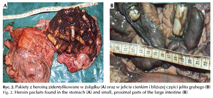 W literaturze opisywano przemyt narkotyków tą metodą przez mężczyzn, kobiety, dzieci, a nawet zwierzęta 18–21. Zazwyczaj przemytnicy ukrywają narkotyki w układzie pokarmowym, choć u mężczyzn zdarza się także ukrywanie ich w odbycie 22, 23. W opisywanym przypadku denat był mężczyzną, a transportowane pakiety zawierające heroinę ujawniono w żołądku i górnym odcinku układu pokarmowego, co wskazuje na ich połknięcie.