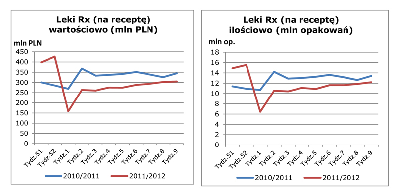 Największe spadki sprzedaży IMS Health zanotował w grupie leków na receptę. Na początku marca, narastająco po 9 tygodniach 2012 roku, sprzedaż tych leków wyniosła ponad 2,4 mld złotych i była o 20 proc. (blisko 600 mln złotych) mniejsza niż rok wcześniej. W ujęciu ilościowym spadek sprzedaży leków na receptę wyniósł 17 proc.