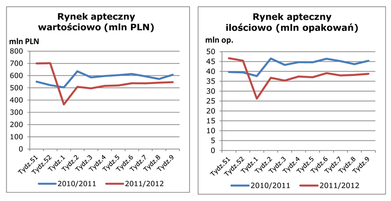 Jak wynika z danych pochodzących z panelu aptek współpracujących z IMS Health, niezależną firmą badającą rynek farmaceutyczny, sprzedaż leków i innych produktów farmaceutycznych w aptekach (mierzona w PLN na poziomie cen detalicznych brutto) spadła po 9 tygodniach 2012 roku o 14 proc. w ujęciu rdr i wyniosła ponad 4,5 mld złotych.
