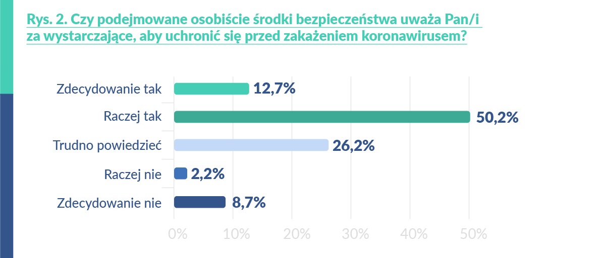 W sumie więcej niż co trzeci Polak nie ma pewności, że podejmując osobiste środki bezpieczeństwa zdoła uchronić się przed COVID-19. Co czwarty pytany nie miał pewności czy postępuje bezpiecznie, a co dziewiąty uznaje własne postępowanie za niewystarczające, aby skutecznie ustrzec się przed zakażeniem SARS-CoV-2. Osobiste środki ochrony się przed zakażeniem koronawirusem uznało za wystarczające w sumie 62,9 proc. osób uczestniczących w sondażu BioStat.