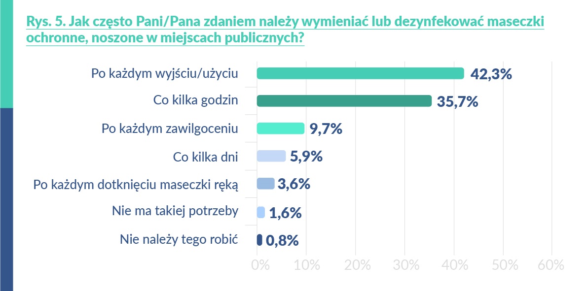 Wymieniać lub dezynfekować maseczki ochronne, noszone w miejscach publicznych, należy według pytanych o to Polaków, po każdym wyjściu lub uzyciu (42,3 proc. wskazań), ewentualnie co kilka godzin (35,7 proc.).