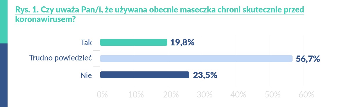 - Tylko co piąty Polak uważa, że używana przez niego obecnie maseczka skutecznie chroni przed koronawirusem – wynika z sondażu, który w połowie kwietnia przeprowadziło Centrum Badawczo-Rozwojowe BioStat. Brak pewności, że maseczki ochronne są skuteczne wyraża aż 56,7 proc. respondentów, a 23,5 proc. jednoznacznie ocenia maseczki za nieskutecznie zabezpieczające przed SARS-CoV-2.