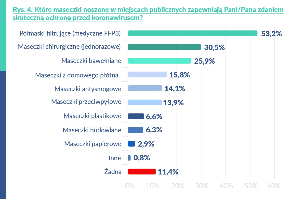Za najskuteczniejsze większość respondentów uważa półmaski filtrujące klasy FFP3 (53,2 proc. wskazań). Skuteczną ochronę w miejscach publicznych, zdaniem uczestników sondażu, zapewniają także chirurgiczne maseczki jednorazowe (30,5 proc.) oraz maseczki bawełniane (25,9 proc.). Według 11,4 proc. pytanych żaden rodzaj osłony twarzy nie chroni należycie przed zakażeniem.