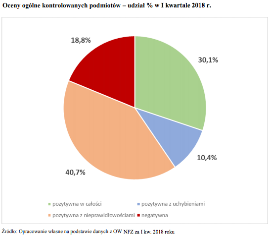 W pierwszym kwartale 2018 roku, oddziały wojewódzkie Narodowego Funduszu Zdrowia przeprowadziły łącznie 425 kontroli w obszarze świadczeń opieki zdrowotnej, w ramach których skontrolowały 454 umowy. 206 umów w ramach kontroli planowych oraz 248 umów w ramach kontroli doraźnych. Skutki finansowe kontroli przeprowadzonych przez NFZ wyniosły ponad 29,7 mln zł. Z tego prawie 26,5 mln zł dotyczyło szpitali.