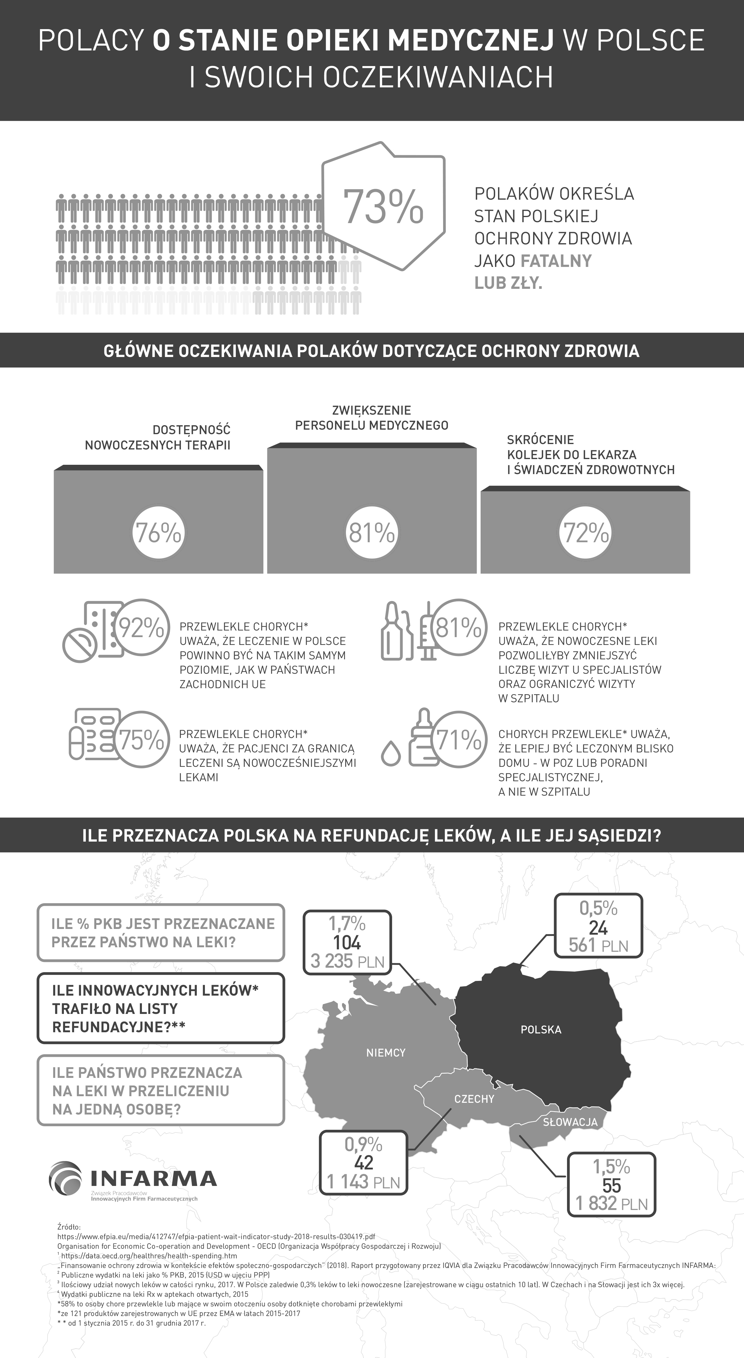 – Niemożliwym jest zapewnienie bezpieczeństwa zdrowotnego Polaków i zachowanie zachodnich standardów leczenia, jeśli publiczne finansowanie ochrony zdrowia w Polsce oraz publiczne wydatki na leki są jednymi z najniższych w Europie. U nas stanowią one nieco ponad 4,5 proc. PKB, podczas gdy w Czechach i na Słowacji – 6, a w Niemczech – aż 10 – twierdzi Bogna Cichowska-Duma, dyrektor generalna INFARMA, cytowana w raporcie. – Polacy nie chcą być gorszą grupą pacjentów, dlatego oczekują tych samych standardów leczenia, które obowiązują w rozwiniętych krajach unijnych. Resort zdrowia musi wreszcie dostrzec, że skokowe zwiększenie publicznych wydatków na ochronę zdrowia, w tym zwiększenie w 2020 roku budżetu na refundację leków o 1,5 mld zł jest koniecznością – informuje Bogna Cichowska-Duma.