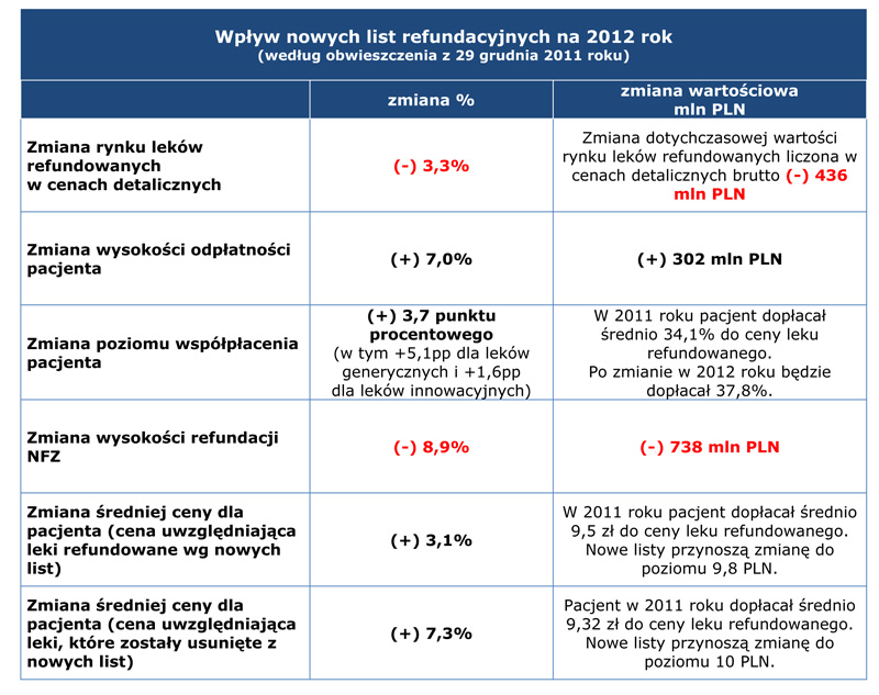 Przełomowym momentem w 2012 roku na rynku leków na receptę będzie miesiąc maj, kiedy to Ministestwo Zdrowia opublikuje kolejne listy refundacyjne, gdzie podstawę do limitu wyznaczać będą udziały rynkowe produktów, które były obecne na listach z 29 grudnia 2011 roku. Podkreślić należy iż z blisko 3500 produktów będących na listach refundacyjnych do końca grudnia 2011 roku, po wejściu w życie nowych list zostało ich już tylko blisko 2500 oraz zakazana została refundacja metodą ułomną.