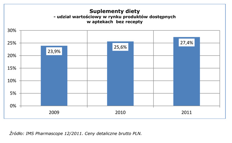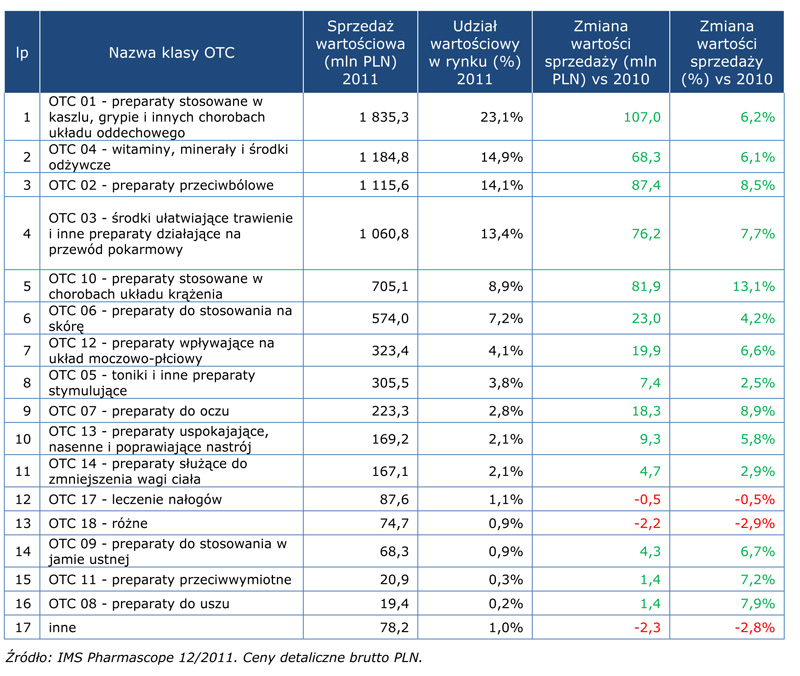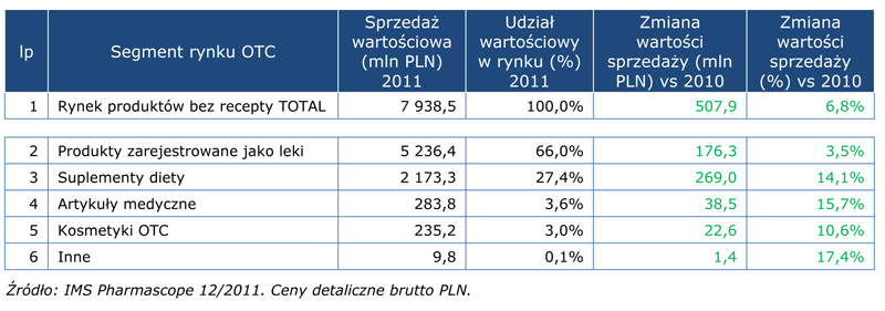 W 2011 roku wartość sprzedaży produktów OTC z aptek do pacjentów wzrosła wartościowo o 6,8% (wartości w cenach detalicznych brutto) i 10,3% w sprzedaży z hurtowni do aptek (wartości w cenach producenta netto), co jest znaczącym wzrostem w stosunku do 2010 roku. Tendencja wzrostowa utrzyma się również w 2012 roku ze względu na wpływ nowej ustawy refundacyjnej, która powoduje spadek rentowności na lekach refundowanych, które odpowiadają za ok. 1/3 obrotu wartościowego statystycznej apteki. Apteki w tym samym czasie będą musiały odrobić część strat na produktach dostępnych bez recepty (OTC,suplementy, dermokosmetyki, artykuły medyczne, artykuły spożywcze).