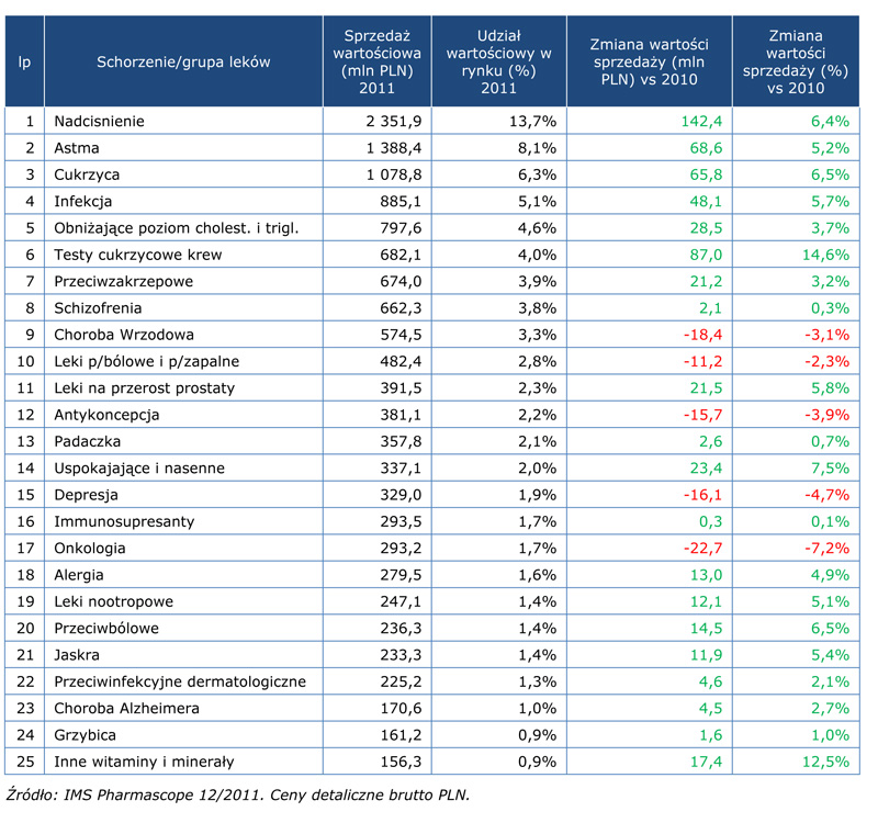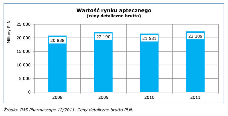 W 2011 roku rynek leków sprzedawanych w aptekach osiągnął wartość 22,3 mld zł, o 3,7% więcej w porównaniu do wartości tego rynku w 2010 roku (wartości w cenach detalicznych brutto). W tym samym okresie wartość rynku szpitalnego w porównaniu do roku ubiegłego wzrosła o 7,0% i osiągnęła poziom 2,97 mld zł (wartości w cenach producenta netto).