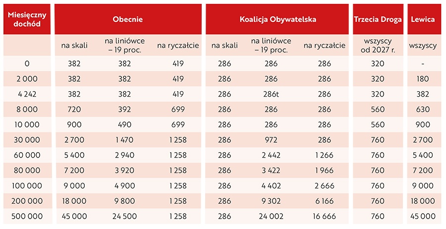 – Propozycja Koalicji Obywatelskiej zakłada, że firmy z dochodem w przedziale od 0 zł do 30 tys. miesięcznie płaciłyby taką samą składkę zdrowotną, czyli 286 zł składki, z wyjątkiem tych na podatku liniowym – wyjaśnia „Gazeta Wyborcza”.