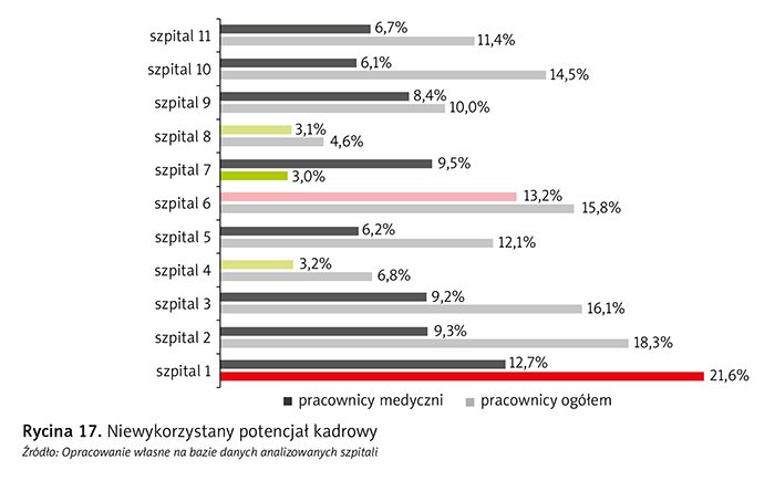 Jak wynika z ryciny 17, niewykorzystanie potencjału kadrowego analizowanych szpitali było związane z niewykorzystaniem potencjału łóżkowego i wahało się od 3,0% do 21,6% pracowników zatrudnionych średnio w 2018 r., w tym niewykorzystanie potencjału kadr medycznych wahało się od 3,2% do 13,2%.
