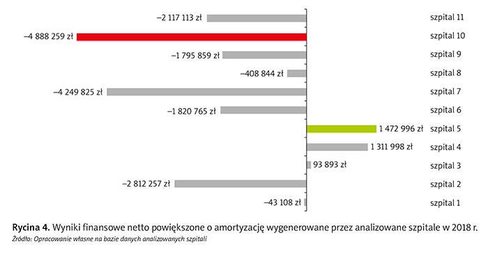 Rycina 4 przedstawia wyniki finansowe netto powiększone o amortyzację wygenerowane przez analizowane szpitale w 2018 r.