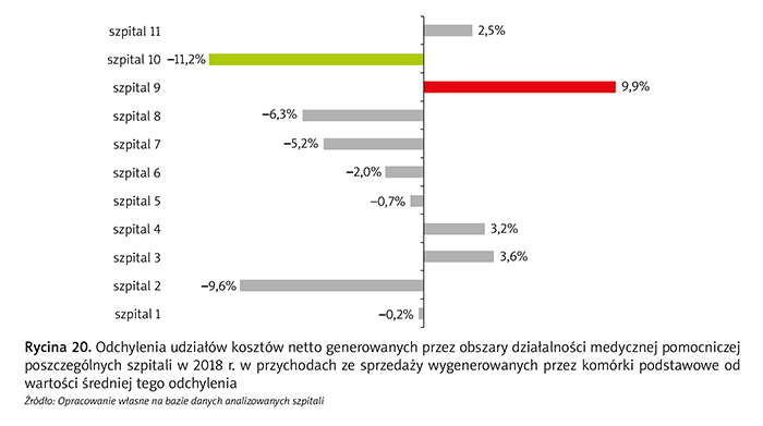• wartość międzyszczytowa odchylenia udziałów kosztów netto generowanych przez obszary działalności medycznej pomocniczej poszczególnych szpitali w 2018 r. w przychodach ze sprzedaży wygenerowanych przez komórki podstawowe od wartości średniej wyniosła ok. 21,1%; najwyższą wartość odchylenia międzyszczytowego kosztów netto generowanych przez poszczególne zakresy obszarów działalności medycznej pomocniczej poszczególnych szpitali w 2018 r. w przychodach ze sprzedaży wygenerowanych przez komórki podstawowe od wartości średniej odnotowano w przypadku bloków operacyjnych (ok. 18,1%), następnie apteki szpitalnej (ok. 7,7%) i diagnostyki laboratoryjnej (ok. 6,3%).