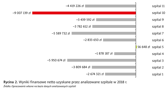 Jak pokazuje rycina 2, wartość uzyskanego przez poszczególne szpitale wyniku finansowego netto wynosiła od ok. +57 tys. zł do ok. –9,0 mln zł.