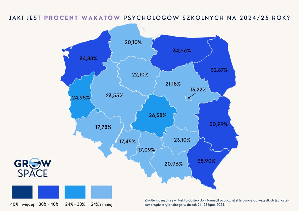 Fundacja GrowSPACE wystosowała zapytanie dotyczące liczby planowanych etatów, obsadzonych etatów oraz wakatów psychologów szkolnych do wszystkich gmin, powiatów oraz miast na prawach powiatów w Polsce. Odpowiedzi udzieliło 89 proc. samorządów w Polsce, a informacje pochodzą z zatwierdzonych arkuszy organizacyjnych szkół publicznych przed rozpoczęciem roku szkolnego.