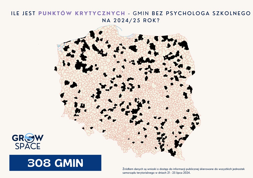 Zgodnie z odpowiedziami samorządów, Fundacja GrowSPACE przedstawiła mapę punktów krytycznych – gmin bez ani jednego psychologa szkolnego przed 1 września. Jest ich 308. Najwięcej punktów krytycznych znajduje się w województwach podkarpackim, łódzkim oraz zachodniopomorskim. Jest to rekordowy spadek o 1/3 w porównaniu z zeszłym rokiem. Wówczas gmin bez psychologa w całym kraju było 450.