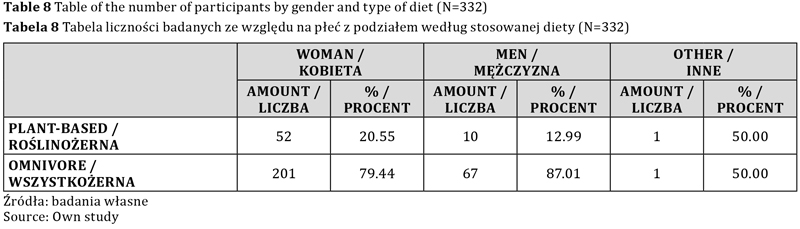 Aż 269 zbadanych (81,02 proc.) osób stosowało dietę wszystkożerną, natomiast pozostałe 63 zbadane (18,98 proc.) osoby stosowały dietę roślinożerną. Do diet roślinożernych zaliczały się jej wszystkie rodzaje, tj. frutarianizm, laktoowowegetarianizm, laktowegetarianizm, owowegetarianizm, pescowegetarianizm, weganizm i witarianizm, o czym uczestników uprzedzono przed badaniem.
