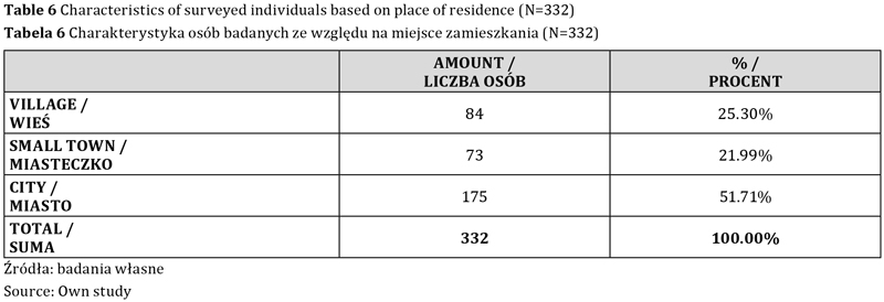 Większość badanych, aż 175 osób (51,71 proc.), mieszkała w mieście powyżej 100 tysięcy mieszkańców, 73 osoby (21,99 proc.) w miasteczku do 100 tysięcy mieszkańców, a 84 osoby (25,30 proc.) na wsi.