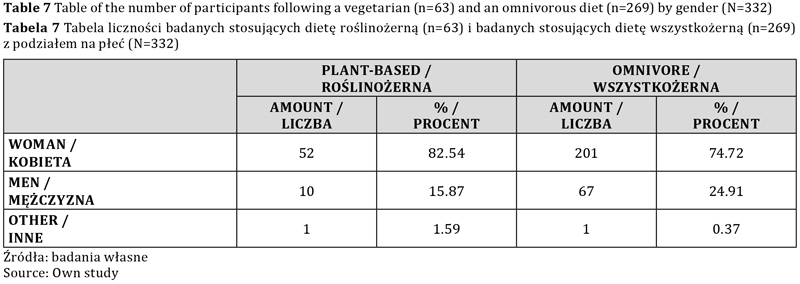 Wśród badanych kobiet, 20,55 proc. stosuje diety roślinne, zaś 79,44 proc. stosuje dietę wszystkożerną. Z kolei wśród badanych mężczyzn, aż 87,01 proc. stosuje dietę wszystkożerną, podczas gdy zaledwie 12,99 proc. stosuje diety roślinne. Jedna z badanych osób niebinarnych stosuje dietę roślinną, a druga dietę wszystkożerną, co stanowi połowę każdej z tych grup.