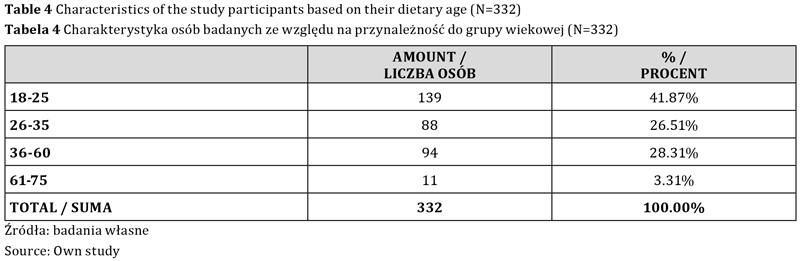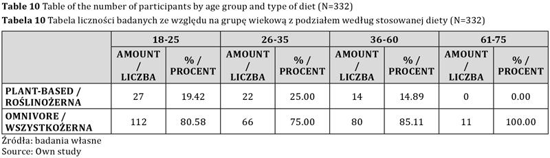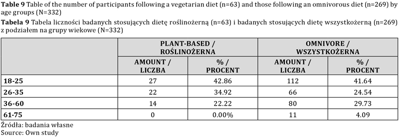 W grupie wiekowej 18–25 lat aż 80,58 proc. badanych stosuje dietę wszystkożerną, natomiast diety roślinne stosuje 19,42 proc. z nich. W grupie wiekowej 26–35 lat 25,00 proc. badanych stosuje diety roślinne, a 75,00 proc. stosuje dietę wszystkożerną. W grupie wiekowej 36–60 lat 14,89 proc. badanych stosuje diety roślinne, a pozostałe 85,11 proc. stosuje dietę wszystkożerną. W grupie wiekowej 61–75 lat wszyscy badani deklarują stosowanie diety wszystkożernej.