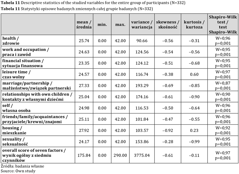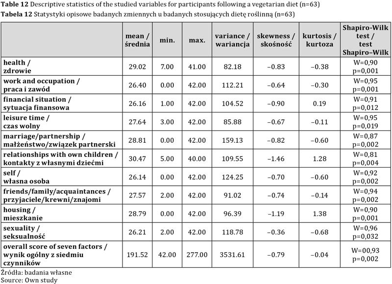 Przeprowadzona została analiza normalności rozkładów poszczególnych zmiennych w celu ustalenia, czy możliwe jest korzystanie z testów parametrycznych. Dla wszystkich czynników test Samuela Shapiro i Martina Wilka wykazał wartość p <0,05, natomiast analiza skośności i kurtozy wykazała, że wartości większości z nich zawierają się w przedziale od –1 do 1. Przyjęto zatem, że rozkład w zakresie badanych czynników nieznacznie różnił się od normalnego. Jedynie badanie czynnika zadowolenia z seksualności u badanych stosujących dietę wszystkożerną analiza wykazała, że rozkład w zakresie badanego czynnika znacznie różni się od normalnego.