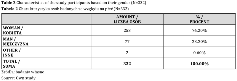 W badaniu uwzględniono łącznie 332 osoby, z czego 253 badanych (76,20 proc.) stanowiły kobiety, 77 badanych (23,20 proc.) to mężczyźni, a 2 badanych (0,60 proc.) osoby identyfikujące się jako niebinarne. Spośród badanych 63 (18,98 proc.) zadeklarowało stosowanie diety roślinnej, a 269 (81,02 proc.) diety wszystkożernej.