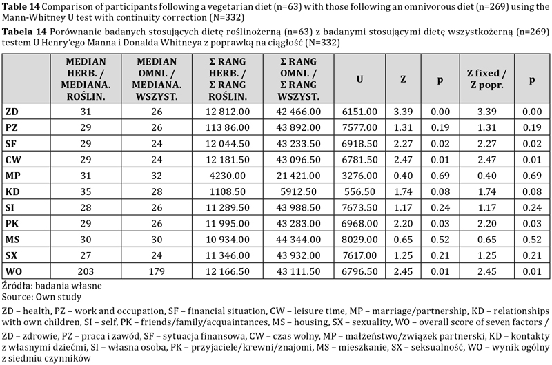 Po analizie statystycznej potwierdzono hipotezę, że osoby, które przestrzegają diet roślinnych, są bardziej zadowolone z życia niż osoby jedzące mięso. Wyniki porównania mediany (203 > 179) oraz średnich wyników ogólnych (191,52 > 172,17) dla badanych grup również to potwierdzają. Osoby na diecie roślinnej oceniają swoje przeszłe i obecne warunki życiowe oraz perspektywy na przyszłość lepiej niż osoby jedzące mięso. Ich ocena tego, co jest dla nich ważne i wpływa na ich zachowanie, jest wyższa niż w przypadku osób jedzących mięso.