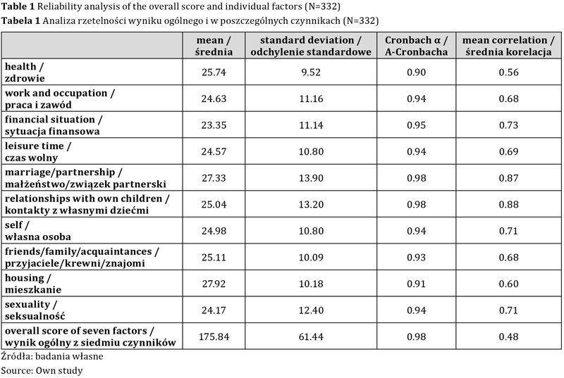 Rzetelność testu zmierzono metodą zgodności wewnętrznej. Wartość α Lee Crombacha była zbliżona do wyników niemieckich i wynosiła 0,96 dla całej skali oraz: 0,86 dla czynnika zdrowia, 0,89 dla czynnika pracy i zawodu, 0,92 dla czynnika sytuacji finansowej, 0,86 dla czynnika czasu wolnego, 0,96 dla czynnika małżeństwa/związku partnerskiego, 0,86 dla czynnika kontaktów z własnymi dziećmi, 0,80 dla czynnika własnej osoby, 0,85 dla czynnika przyjaciół/krewnych/ znajomych, 0,83 dla czynnika mieszkania, 0,91 dla czynnika seksualności. Analiza rzetelności wyniku ogólnego i w poszczególnych czynnikach w badanej próbie jest wyższa aniżeli w próbie zbadanej do adaptacji narzędzia badawczego i została przedstawiona poniżej w formie tabeli.