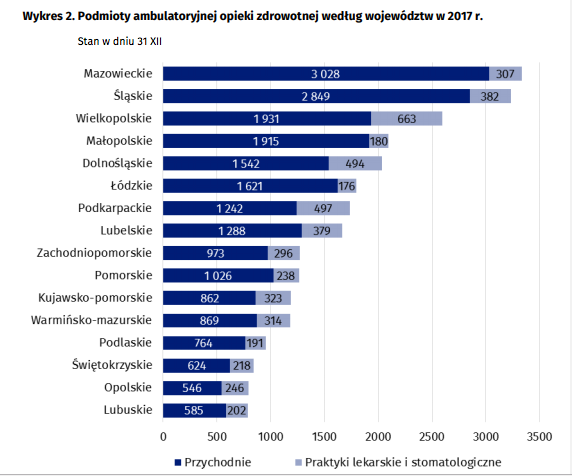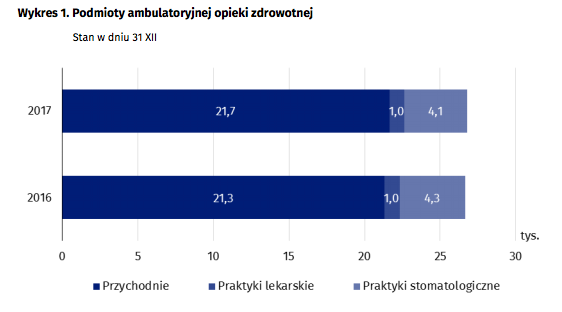 W końcu 2017 roku świadczenia ambulatoryjnej opieki zdrowotnej realizowało 21,7 tys. przychodni oraz 5,1 tys. praktyk lekarskich i stomatologicznych świadczących usługi w ramach środków publicznych. Udzielono 320,2 mln porad, w tym 285,7 mln lekarskich i 34,5 mln stomatologicznych.
