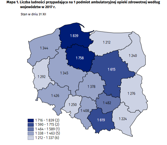 W 2017 r. przeciętna liczba porad ambulatoryjnych w przeliczeniu na 1 mieszkańca wyniosła 8,3. Największą wartość tego wskaźnika (8,9) odnotowano w województwie mazowieckim, a najniższą (7,3) – w opolskim.