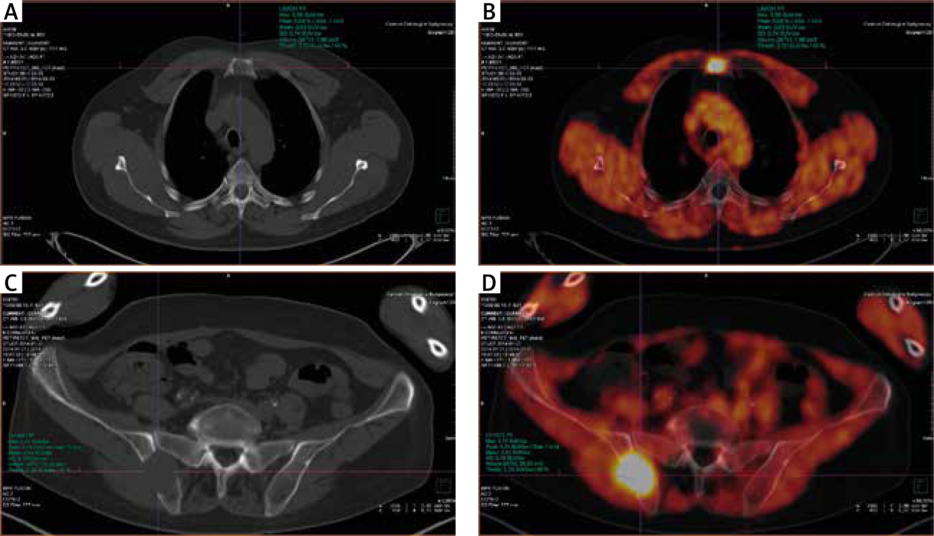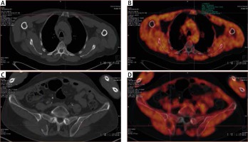 The same patient after completion of therapy. A) Computed tomography (CT) – lytic lesions localised in the sternum – no difference to the status before therapy. B) 18F-FET PET/CT, fusion image with low FET uptake in the lytic lesion visible on CT in sternum. C) Computed tomography – lytic lesion localised in the right iliac crest – no difference to the status before therapy. D) 18F-FET PET/CT fusion image with low FET uptake in iliac crest
