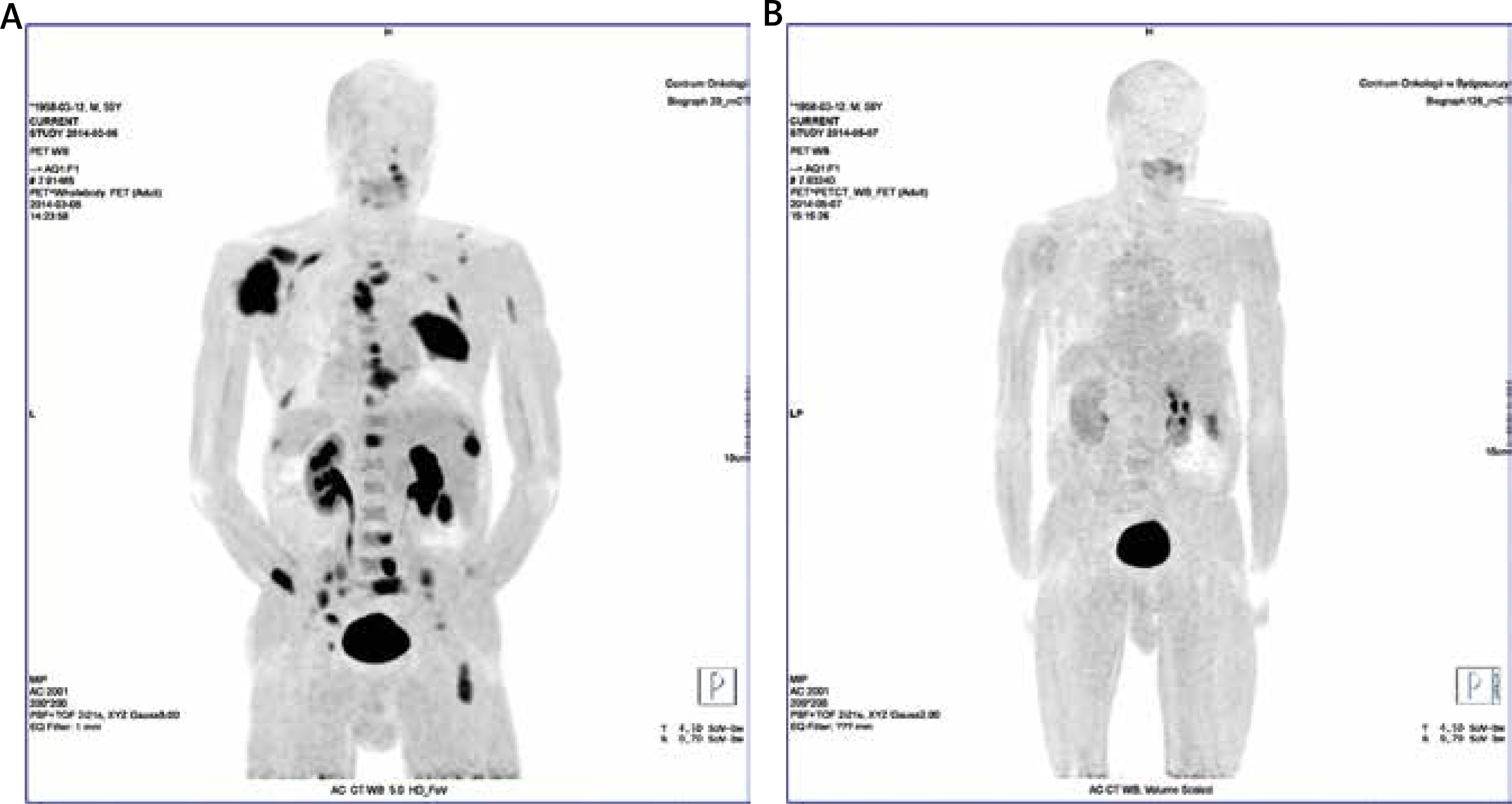 Patient no. 21. Myeloma-related lesions before and after the treatment. MIP images of the FET uptake in the patient body. A) Multiple FET lesions localised in the skeleton of the pathological uptake of FET. B) MIP image after chemotherapy. Complete disappearance of pathological FET uptake may suggest metabolic response to the treatment