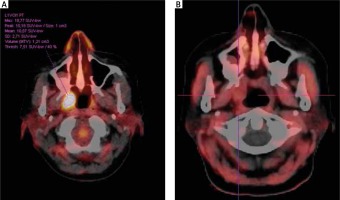 Patient no. 32. A) Solitary myeloma lesion suspected in the right palatine tonsil, positive in FDG PET/CT, showing high uptake SUVmax 18.77. B) Negative FET PET/CT result showing no tracer uptake in the right tonsil. No subsequent clinical progression of myeloma was observed on further follow-up