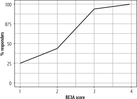 The total number of responders was higher in patients with a higher BE3A score (Table 1). The number of responders was 3 (25%), 14 (43.75%), 15 (93.75%) and 2 (100%) with a BE3A score of 1, 2, 3 and 4 respectively (Fig. 1).