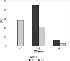 In patients with a MELD score of < 15, 33 out of 49 (67.3%) successfully met the primary end-point of our study, whereas 16 (32.7%) patients failed to do so. However, only 1 in 13 (7.6%) patients with a MELD score > 15 attained a state of compensated liver disease after DAA therapy. In CTP class B, 34/55 (61.8%) succeeded in attaining CTP class A status after treatment. None of the patients with a baseline CTP score > 9, i.e. CTP class C, could attain a persistent compensated state, i.e. CTP A, despite DAA therapy in the follow-up period of 36 weeks.