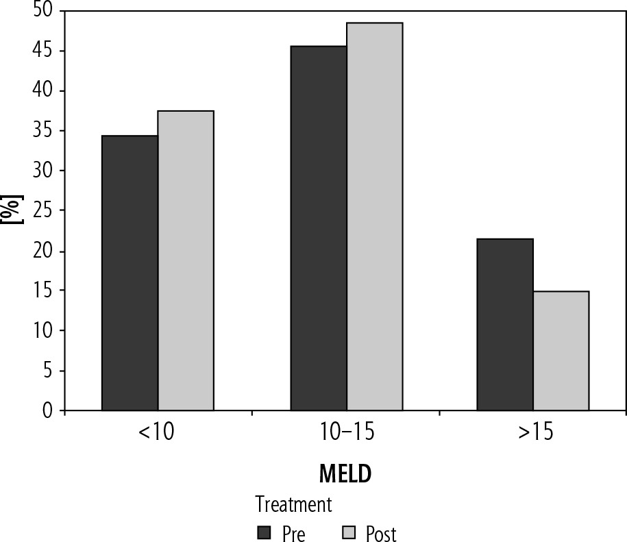The number of patients with a MELD score < 10, 10-15 and > 15 in the pre-treatment period were 21 (33.9%), 28 (45.1%) and 13 (21%) respectively. In the post-treatment period, the number of patients with a MELD score < 10 increased to 23 (37.1%), and that in 10-15 and > 15 groups was 26 (48.4%) and 9 (14.5%) respectively (Fig. 3).