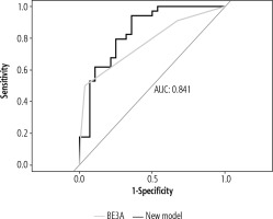 However, comparison of our model with BE3A score using ROC analysis revealed better results with our composite model, with an AUC value of 0.841 and 0.771 respectively, although DeLong’s test for two correlated ROC curves revealed a statistically non-significant result (p = 0.29) (Fig. 4).