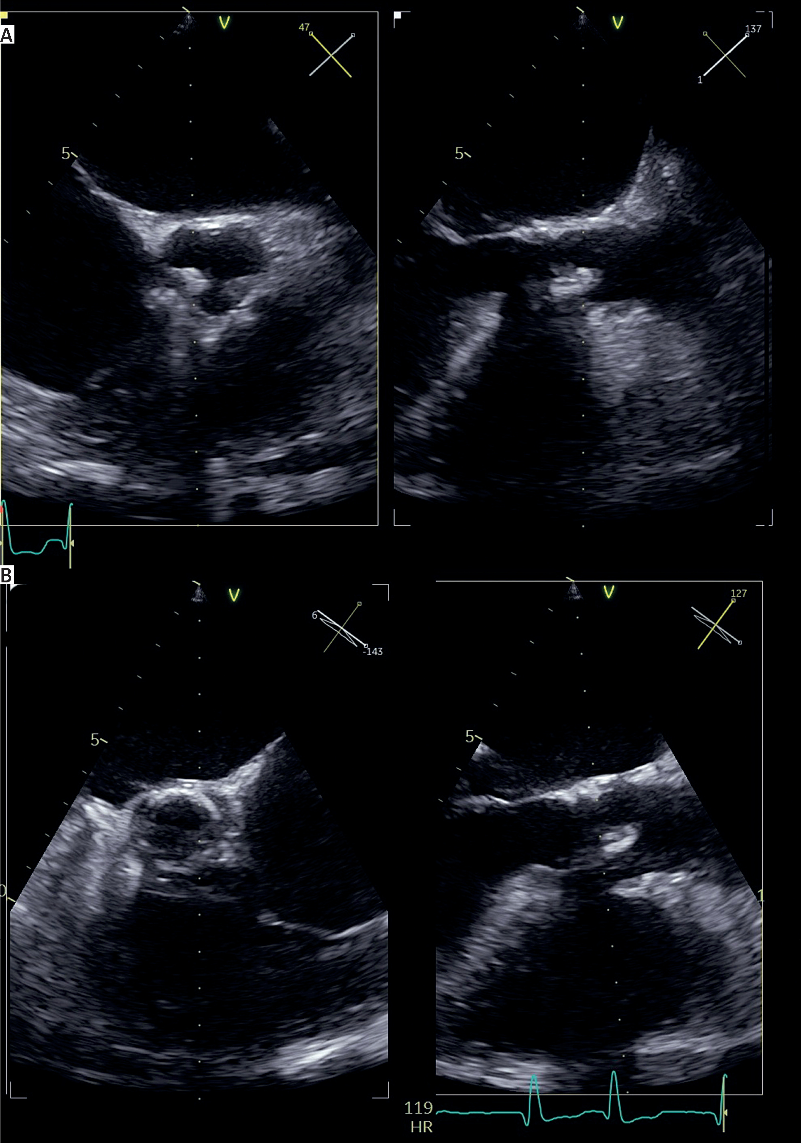 Transesophageal echocardiography. A – preoperative view of the biological prosthesis with visible vegetation. B – Postoperative view after valve-in-valve procedure with visible self-expandable valve
