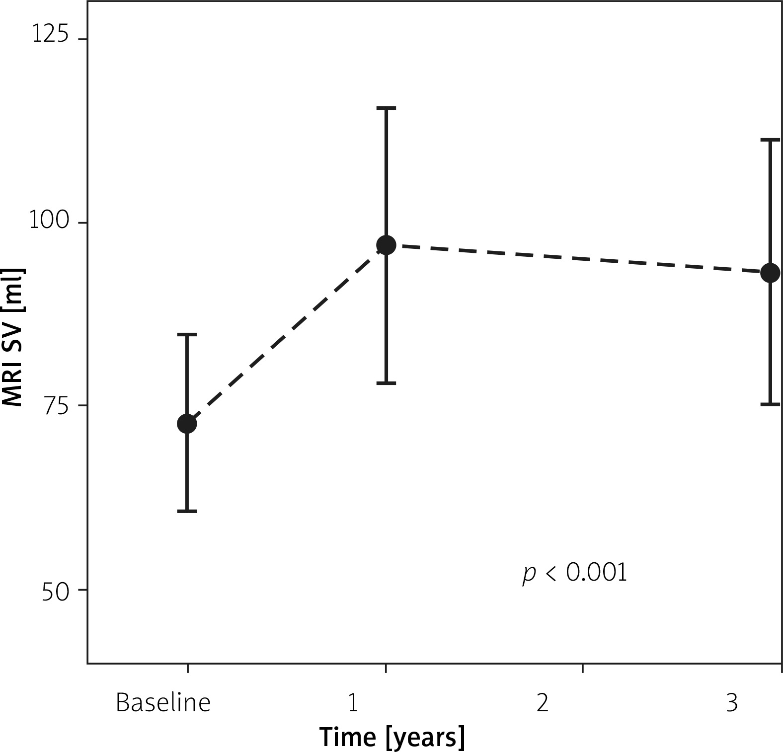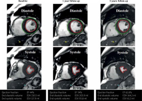 Throughout 3 years there were no significant changes in LVEDV by the imaging methods used: SPECT 157.1 ±27.1 ml vs. 174 ±24 ml (baseline vs. 1 year); cMRI 171.6 ±17.7 ml vs. 188.2 ±23.4 ml vs. 181.9 ±17.6 ml (baseline vs. 1 year vs. 3 years), and echo 137 ±13.3 ml vs. 135 ±2.9 ml vs. 148 ±21.8 ml (baseline vs. 1 year vs. 3 years), p > 0.05 for all. However, there was a significant increase in stroke volume measured by SPECT at baseline vs. 1 year (53.3 ±7.6 ml vs. 68.2 ±5.2 ml); cMRI at baseline vs. 1 year vs. 3 years (72.7 ±5.2 ml vs. 96.9 ±8.1 ml vs. 93.2 ±7.8 ml) and echo at baseline vs. 1 year vs. 3 years (64.3 ±2.9 ml vs. 68.8 ±4.1 ml vs. 81.9 ±7.1 ml), p < 0.05 for all.